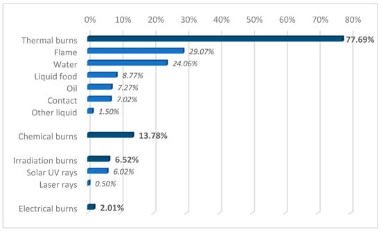 - Stewart, B.T. Epidemiology, Risk Factors, and Prevention of Burn Injuries. 2 November 2022. Available online: https://www.uptodate.com/contents/epidemiology-risk-factors-and-prevention-of-burn-injuries (accessed on 15 August 2024).