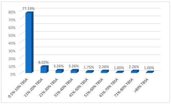| 11–20% TBSA | 4.26% (n = 17) | 3.76% (n = 15) |