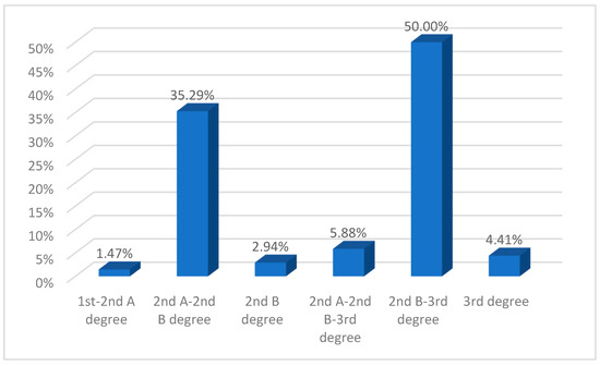 | 3rd degree | 20.18% (n = 45) | 12.50% (22) | 26.03% (n = 38) | 11.46% (n = 29) |