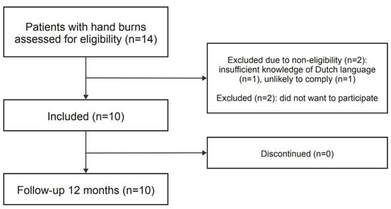 Of the 14 available patients, two patients were excluded due to non-eligibility and another two patients declined to participate. We evaluated 14 consecutive hands of 10 patients between March 2017 and December 2019 (Figure 1). The patient group consisted of nine men and one woman, and they had a mean age of 56.3 ± 12.5 years (Table 1). Eight patients had both hands burned, among which, in four patients, both hands were treated with enzymatic debridement, leading to the inclusion of 14 enzymatically treated hands. All digits of these included hands were affected. The burns in one patient (both hands) were limited to the dorsal side of the hands. The other nine patients had burns on both the dorsal and volar sides of their hand(s). Nine patients received hand therapy directly upon admission. The duration of pressure garment use had a median of 8 months. Silicon therapy was administered in eight patients, with a median of 6 months. None of the patients received corticosteroid treatment (Figure 2).