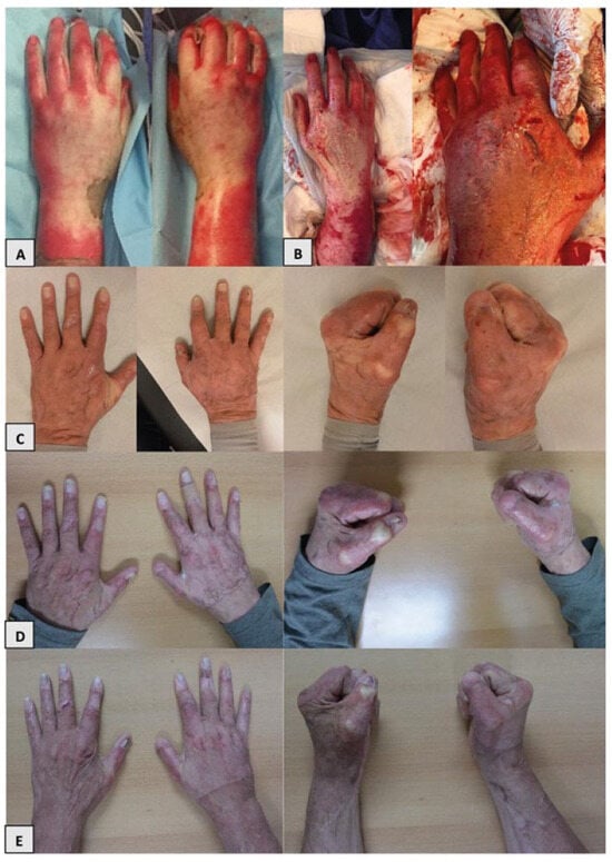 Evaluation of the hands after NexoBrid® treatment. (A) = flame burn; (B) = post-enzymatic debridement; (C) = 3 months post-burn; (D) = 6 months post-burn; (E) = 12 months post-burn.