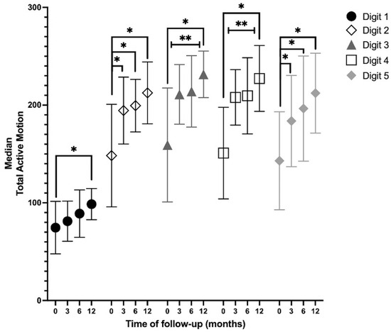 - AROM: Digits 2, 3, and 5 showed an increase in the median TAM during all measurements. Digits 1 and 4 showed an increase in the median TAM during all measurements, except for the measurements between 3 months and 6 months. In digits 3 and 4, there was a statistically significant increase between baseline and 3, 6, and 12 months; between 3 months and 12 months; and between 6 months and 12 months. In digits 2 and 5, there was a statistically significant increase in the TAM over time between baseline and 3, 6, and 12 months. At 12 months, the TAMs of digits 3 and 4 returned to near normal (260°) (Figure 3).