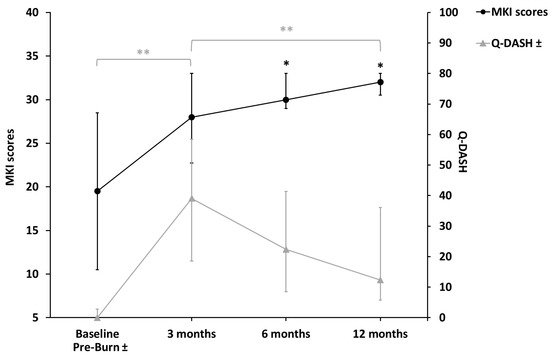 - Q-DASH: There was a statistically significant increase (p = 0.005) between the pre-burn period (median 0.0, IQR 0.0–2.8) and 3 months (median 39.1, IQR 18.6–58.4) and a reduction between 3 months and 12 months (median 12.3, IQR 5.8–36.1) (p = 0.005) (Figure 4).