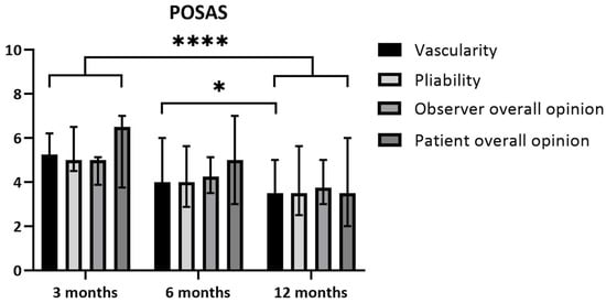 Figure 5. POSAS scores over time. POSAS = Patient and Observer Scar Assessment Scale. Friedman test, * p < 0.05; post hoc analysis, Wilcoxon signed-rank test, p < 0.017, **** indicates statistical significance for all four items mentioned. - Observer scores: The overall opinion of the observer regarding the scars 3 months after the burn yielded a median of 5.0 (IQR 3.9–5.1) and a median of 3.8 (IQR 3.0–5.0) after 12 months. This difference over time was statistically significant, with p = 0.011. The scores for pliability improved between 3 and 12 months, with a median of 5.0 (IQR 4.5–6.5) at 3 months and a median of 3.5 (IQR 2.5–5.6) at 12 months. This difference was statistically significant (p = 0.011). The scores for vascularity showed a median of 5.3 (IQR 3.9–6.1) at 3 months and a median of 3.5 (IQR 1.9–5.0) at 12 months (p = 0.002). Vascularity also improved significantly between 6 and 12 months post-burn. The median at 6 months was 4.0 (IQR 3.8–6.0) and the median at 12 months was 3.5 (IQR 1.9–5.0) (p = 0.009) (Figure 5).
