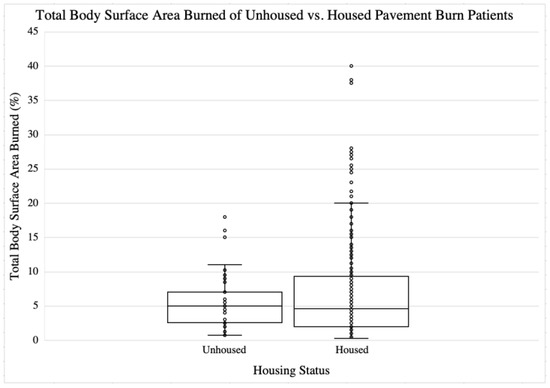 The primary outcome of this study was the difference in TBSA between the patient groups. It was found that there was no significant difference in TBSA between unhoused and housed patients (unhoused = 5.81% vs. housed = 6.81%; 95%CI = (−0.90,0.96); p = NS. For the secondary outcomes, it was identified that there was no significant difference in hospital length of stay (unhoused = 22.7 days vs. housed = 19.1 days; [95% CI = −11.5, 4.4]); p = NS. The burn injury characteristics and hospital course of the study cohort patients are further depicted in Table 2. A graph of TBSA in unhoused versus housed patients in this study is shown in Figure 2.
