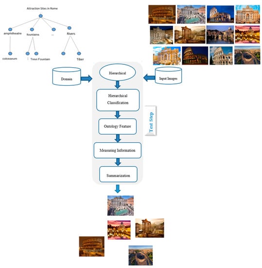 The test module contained the classification test and summarization steps. The inputs of the test module were domain ontology and image collection to be summarized. In this part, the hierarchical classification was done by choosing the sub-trees that the image was classified with most confidence. In the next steps, ontology features were extracted, and semantic information content of each image was obtained. Finally, a summarization algorithm was proposed to select representative images based on the computed ontology features. The example in Figure 2 shows images of Rome city. The test module got the ontology about attraction sites in Rome as the input knowledge and did the classification of images. Finally, a representative set of images was chosen. In the following two parts, we have discussed the details of the classification and summarization modules.