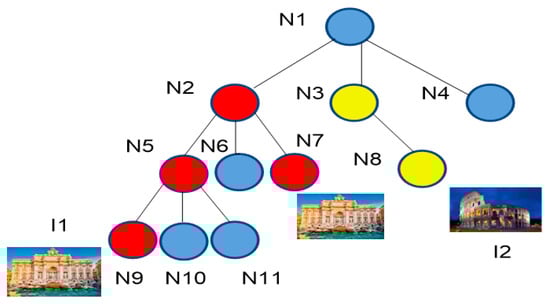 A bag of features was generated for every image using the nodes selected by a hierarchical classifier. All the nodes in the paths from the root to the target node were considered as features. If an image was mapped to multiple sub-trees in the ontology, all nodes from all sub-trees were included. Figure 4 shows a hypothetical sample of domain ontology with two images I1 and I2. I1 was mapped to N9 and N7, and I2 was mapped to N8. The corresponding feature vector is represented (colored) in Table 2 that could be formulated as below: