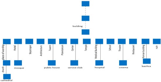 Most of the researches working on the thousands of images test their techniques on the Flickr Images subset [,,,,,,,]; earlier work used google search results as their input images [,]. A bunch of researches uses location and cities as their whole or part of the test domain [,,,,]. In this paper, we needed the domain ontology of images, so we decided to test our approach for the cities and location images. The dataset contained 40,000 images from Flickr corresponding to 40 different cities. The dataset has been provided in []. DBpeida knowledge base was used for providing the domain ontology. DBpeida is a platform, which is designed for structured content extraction from Wikipedia and is accessible online []. Knowledge about visiting places in cities was extracted, and corresponding ontology nodes in WordNet were retrieved. Parts of WordNet hierarchy corresponding to the selected synsets were extracted. Ontology nodes were selected, and recursively parent nodes were retrieved until reaching to the root. The final ontology was a part of WordNet. Figure 5 shows a part of our sub-graph for building node with 17 leaf concepts.