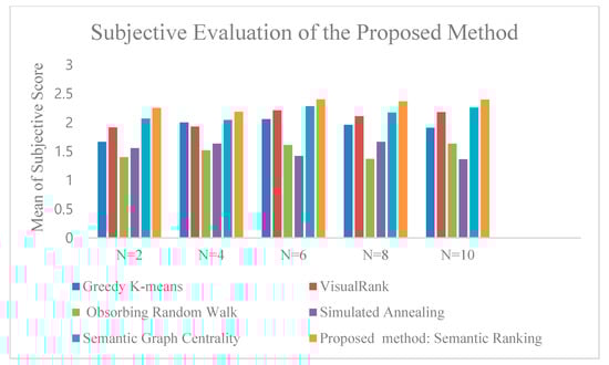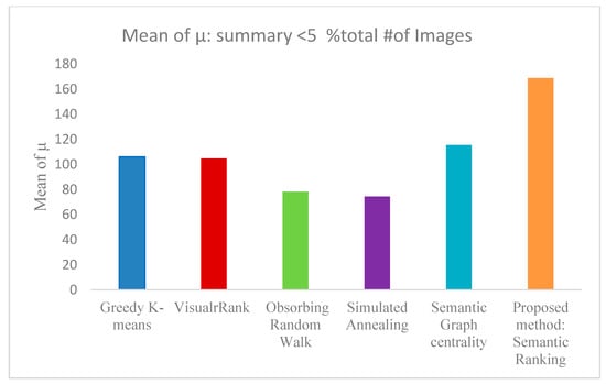 The proposed image summarization method was evaluated by both subjective and objective measures. Usually, subjective assessment is done in image summarization methods [,,,]. For the subjective evaluation, a small set of 240 images corresponding to six cities {,’saint-Petersburg’, ‘Paris’, ’London’, ’Barcelona’, ‘Rome’, ’Hong Kong’} were selected. The original set and the summary set showed eight graduate students, and they were requested to assign summarization scores according to Table 3. Figure 6 compares the outcomes where the vertical axis presents the average subjective score among users versus different summary size. The summary size was changed from 1% to 5% of the original image collection. Error bars were assigned with a 95 percent confidence interval calculated according to the standard error of the sample average. The outcomes showed that the approach was successful in selecting a summary of images.