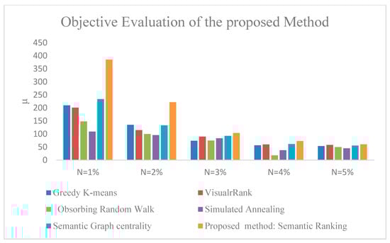 Objective assessment of the introduced approach means of μ ratio (Equation (8)) for different sizes of summaries.
