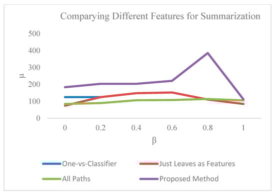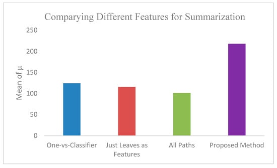 We now turned to investigate the effect of the classifier module and the ontology features on the introduced technique goodness. To do so, we designed three experiments. In the first experiment, we swapped our classifier with a flat classifier. So instead of using a hierarchical classifier, we used a one-vs-all approach for doing the classification. In the second experiment, we used a hierarchical classifier, but instead of using all ontology nodes as features, we used just leaf nodes as features. On the other hand, the ontological structure was not used in the summarization and just in classification. In the third experiment, we used all the paths of the ontology for doing the classification and used all the nodes of the ontology as ontology features. It means that we ignored the condition of Equation (1) (α parameter) in the classification step. Figure 13 and Figure 14 show the comparison. As seen, the result of the summarization method got better when the hierarchical classifier was used instead of a flat classifier. Furthermore, it gave the best result when the ontology nodes, based on Equation (1), were used as features. This indicated that hierarchical semantic relations could improve the result of image summarization and classification methods. This could be further enhanced by using a sophisticated form of knowledge like fuzzy ontologies [] or context-aware reasoning [].