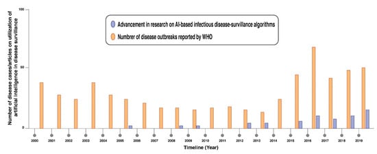 On this, though detection times may vary greatly in respect virus types (influenza, Henipavirus (Nipah virus), Filoviruses like Ebola, and Flavivirus like Zika et cetera) [16,17] and other characteristics, the constant is that technological advancement is clearly aiding in reducing their detection time. This was evidenced in the recent case of COVID-19, taking only seven days for detection. In particular, advancements in computing capacity brought about by the emergence and widespread employment of such technologies like AI [18], machine learning, Big Data [19,20], and Cloud Computing have allowed massive amounts of data from various sources to be captured and analyzed in real-time and from them insightful predictions are being made. Advancements in AI-based infectious disease-surveillance algorithms and their use to aid early infectious disease detection is further noted in Figure 1 below, where a comparison between the detection time of previous infectious disease outbreaks in the past 20 years, as reported by the WHO, reveals a trend where AI-based tools have gained in efficiency. This is of particular importance because previously endemic diseases are now being mapped through human importation to non-endemic countries, thus causing pandemic outbreaks.