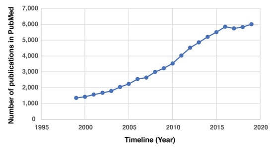 Although policies are now being revised to prevent the spread of a disease to non-endemic countries, much work is still needed to identify an outbreak before its actual occurrence so that healthcare strategies can be better managed and instigated. A PubMed query with the keywords “(“artificial intelligence”) OR (“machine learning”) OR (“deep learning”) AND (“disease surveillance”) AND (“1999/01/01”[Date-Publication]: “2019/12/31”[Date-Publication])”, further supports that there has been an increasing trend in research involving the development of AI-based algorithms to better predict the outcomes of current healthcare data, and thus to predict disease outbreaks in advance. Although we do observe that certain years do not evidence any research on AI-technologies in disease surveillance, there has been significant research performed on the theme of AI-based personal healthcare. Figure 2 shows the increasing number of AI-based research on healthcare through a search on PubMed using the keywords “(“artificial intelligence”) AND (“epidemic”) OR (“endemic”) AND (“1999/01/01” [Date-Publication]: “2019/12/31” [Date-Publication])”, represented in the y-axis, and the x-axis represents years.