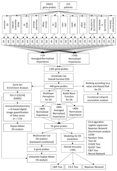 Analysis algorithm. In this project, two types of artificial neural network analyses were performed: Multilayer Perceptron (MLP) and Radial Basis Function (RBF). The input data were the gene expression of 54,613 gene-probes from 414 patients with diffuse large B-cell lymphoma (DLBCL). The target variables were the outcome of the overall survival (dead versus alive), as well as several relevant clinicopathological characteristics, including the cell-of-origin classification and the International Prognostic Index (IPI). The gen-probes were ranked according to their normalized importance (NI). A cutoff of >70% of normalized importance and >1% of averaged normalized importance was applied. Cox regression analysis (univariate and multivariate) reduced the final list to the most relevant genes (n = 448). The gene-set enrichment analysis (GSEA) technique confirmed the association toward bad or good prognosis and PD-L1 and IKAROS were validated in an independent series of Tokai University. Additional data reduction was performed with Cox and Kaplan–Meier overall survival analyses, second round of artificial neural networks and predictive modeling in a multistep process up to a final 16 and 6 genes sets.