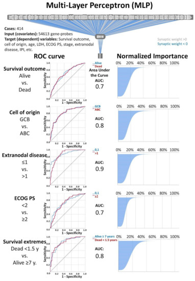Multilayer Perceptron (MLP) analysis: The artificial neural network analysis consisted of applying of Multilayer Perceptron (MLP) and Radial Basis Function (RBF) artificial neural networks on publicly available gene-expression data from DLBCL patients. For both MLP and RBF, the inputs (covariates) were the 54,613 gene-probes, and the target variables (dependent variables) were the overall survival outcome (dead vs. alive) and a series of clinicopathological variables, including the cell of origin molecular classification, age, LDH, ECOG Performance Status, clinical stage, extranodal disease and IPI. A total of 26 individual AI analyses were performed. The most relevant genes were selected according to their normalized importance, following a strategy as described in Material and Methods and in
