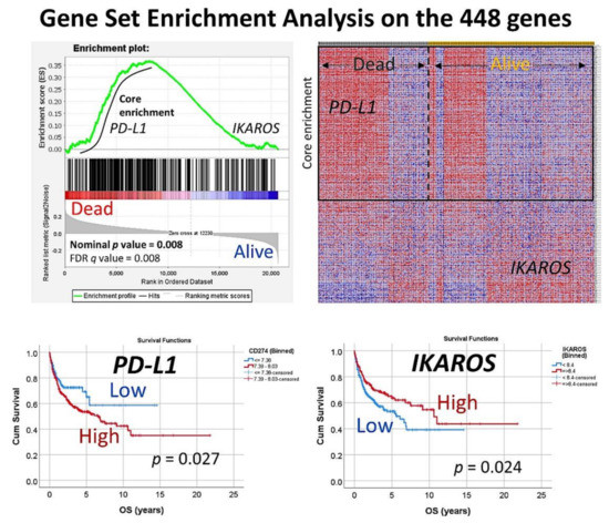 Gene-set enrichment analysis on the set of 448 genes. The set of 448 genes was used in a GSEA analysis, to confirm the association of this set to the overall survival outcome of the patients (dead vs. alive phenotype). In the core enrichment associated to poor prognosis (dead), the PD-L1 (CD274) gene was identified. In the side of good prognosis (alive), the gene IKAROS was identified. Both markers that belong to the immune checkpoint pathway were further validated by immunohistochemistry in an independent series of DLBCL from Tokai University Hospital.