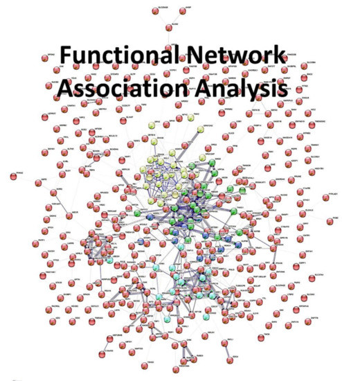 Functional network association analysis on the set of 448 genes. In order to analyze the set of 448 genes according to the biological processes, molecular function, cellular component and pathways, a network analysis was made. The network was characterized by 390 nodes, 791 edges, an average node degree of 4.06, average local clustering coefficient of 0.376 and a protein-protein interaction (PPI) enrichment p-value of 1 × 10−16. In general, the set belonged to the Gene Ontology (GO) nuclei acid metabolic process (GO: 0090304, False Discovery Rate (FDR) = 0.00012). Of note, within the general network, five clusters could be identified.