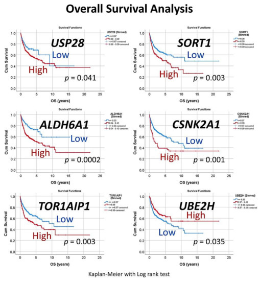 Univariate overall survival analysis of the set of six genes. For each of the six genes, a cutoff was searched to stratify the patients into high and low expression. Then, the overall survival for each marker was analyzed, using the Kaplan–Meier with Log rank test.