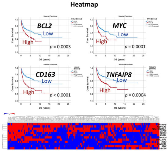 Correlation with known pathogenic biomarkers of DLBCL. The clinical relevance for overall survival of known pathogenic biomarkers, including BCL2, MYC, CD163 and TNFAIP8, was tested in this series. After that, an unsupervised hierarchical clustering was performed with the set of six genes (USP28, SORT1, ALDH6A1, CSNK2A1, TOR1AIP1 and UBE2H), PD-L1 (CD204), IKAROS, BCL2, MYC, CD163 and TNFAIP8. The dendrogram for the rows showed how TNFAIP8, ALDH6A1, PD-L1 and USP2B clustered in the same group. In addition, CSNK2A1 and MYC were also close.