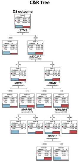 Classification and regression tree (C&R tree): Prognostic modeling was performed, using the set of 16 genes, as shown in