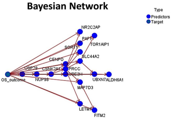 Bayesian Network: The set of 16 genes was also tested, using a Bayesian Network. The result had an overall accuracy above 70%. A Bayesian Network is a graphical model that displays variables (nodes) in a dataset and the probabilistic, or conditional, independencies between them. Causal relationships between the several variables may be represented by a Bayesian Network; however, the links (arcs) between the nodes do not necessarily represent a direct cause and effect.