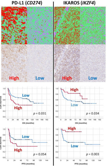Machine-learning-based digital-image analysis of immunohistochemical expression of PD-L1 and IKAROS and their correlation with the survival of the patients. The markers of PD-L1 and IKAROS were identified in the artificial neural network analysis of gene-expression data as bad prognosis and good prognosis markers, respectively. The immunohistochemical expression was tested in an independent DLBCL series from Tokai University. For the digital-image quantification, an AI-based segmentation method was used. Correlation with the survival of the patients confirmed the AI results.
