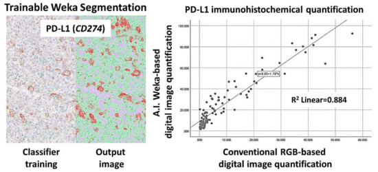PD-L1 (CD274) marker validation, using digital image. Digital image quantification of PD-L1. PD-L1 was analyzed, using a conventional RGB-based analysis, as well as with a machine-learning trainable segmentation method. Good correlation was found between both methods.