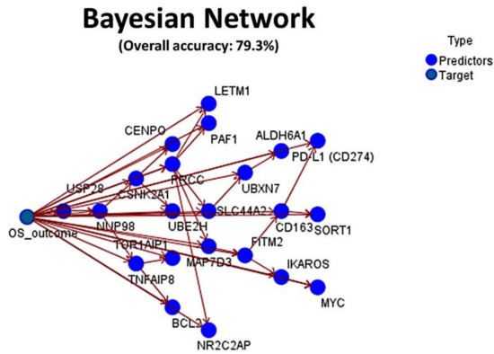 Final integrated Bayesian Network. The set of 16 genes, PD-L1 (CD274) and IKAROS were merged with known biomarkers with prognostic relevance in diffuse large B-cell lymphoma (DLBCL), including BCL2, MYC, CD163 and TNFAIP8. The resulting machine-learning analysis had an overall accuracy for prediction of the overall survival of 79.3%.