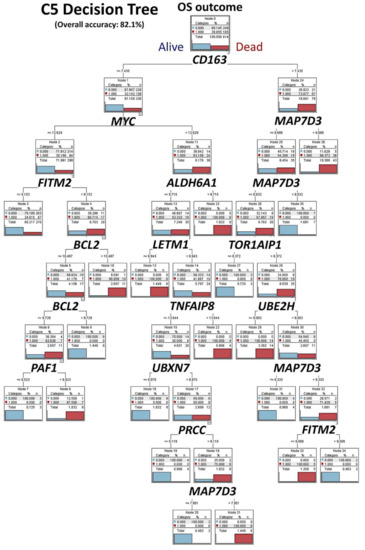 Final integrated C5.0 decision tree. The set of 16 genes, PD-L1 (CD274) and IKAROS were merged with known biomarkers with prognostic relevance in diffuse large B-cell lymphoma (DLBCL), including BCL2, MYC, CD163 and TNFAIP8. The resulting machine-learning analysis had an overall accuracy for prediction of the overall survival of 82.1%. Dead outcome, red color (number 1). Alive outcome, blue color (number 0).