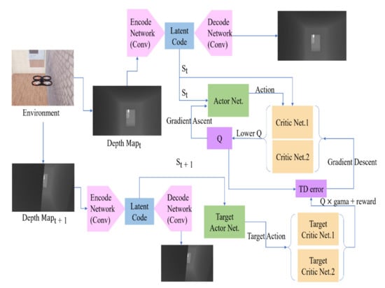 During the SAC training period, we use strategy and environment interaction and store the data of each interaction, the current state , the behavior , the reward , and the post-action state into the buffer. After that, we sample (, , , ) from the buffer and estimate its quality (Q value) for the transition →. We use this Q value to weigh our strategy and optimize the strategy in the direction of maximizing it. The workflow of the entire reinforcement learning system is illustrated in Figure 1. We simultaneously train a VAE to generate the same depth map as the input depth map. Then, we use VAE’s encode network to convert the depth map into latent code to participate in training as a state. Different from DDPG, SAC also uses two sets of critic networks to estimate the Q value. In our study, the smaller one is chosen as a candidate for updating.