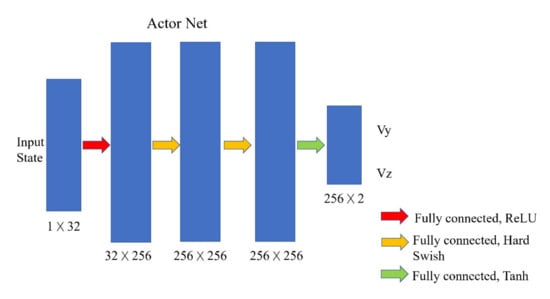 The structure of the actor and critic network is shown in the Figure 3. The actor network is a neural network composed of four fully connected layers. The 32-length latent code generated by the VAE is input into the actor network as the state. The output of the actor network has two values ranging from −1 to 1, representing the velocity of the drone in the y direction (left and right directions) and z direction (up and down directions).