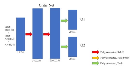 The critic network consists of three fully connected layers. Its function is to estimate the Q value that can be obtained when a certain action value is selected in a certain state. Therefore, the input value of the critic network is a combination of state and action, that is, a code with a length of 34. At the same time, to prevent the overestimation of the Q value, the SAC critic network uses two fully connected layers in the output layer to output two different Q values and take the smallest value in each update.