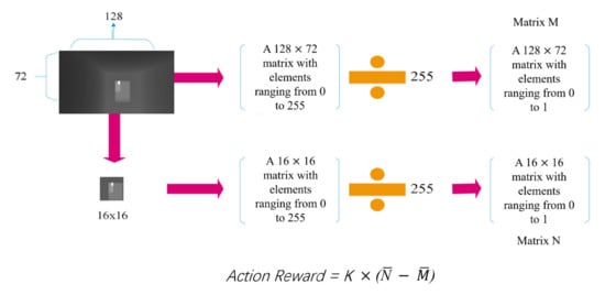 The specific reward values are presented in Table 1. The solution process of action reward is shown in the fourth row of Table 1 and Figure 4. The action reward is the difference between the normalized mean value of the central part of the depth map and the normalized mean value of the entire depth map.