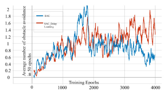 In order to solve this shortcoming, we designed a delayed learning scheme in which we delayed the update of the network until after the end of each epoch. This ensures that every complete flight of the drone follows the same policy. This method stabilizes the training process to a certain extent. To compare the differences between the two algorithms, we trained the two algorithms in the same environment for 4000 epochs and recorded their average obstacle avoidance times in the last 50 epochs. It can be seen from Figure 5 that although the difference in the results is not large, the conventional SAC has greater volatility in our task than the SAC with delayed learning.