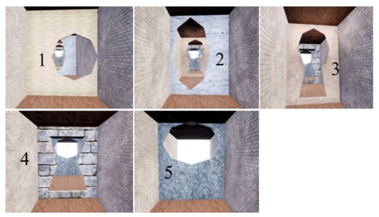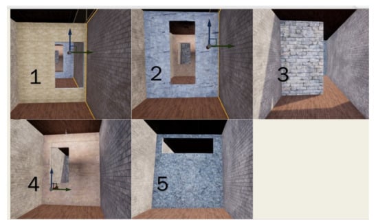 In this experiment, we used Unreal Engine to build a closed corridor with length 60 m, width 6 m, and height 7 m as the flying environment of the drone. Every ten meters in the corridor, a wall with different opening positions was used as an obstacle, as shown in Figure 6. We use these obstacles to divide the corridor into 5-level areas. Every time the drone crosses an obstacle in a single test, it is considered as a level-up. We consider the drone to take off from one end of the corridor and avoid all obstacles (passing through all the openings in the walls) as passing the test.