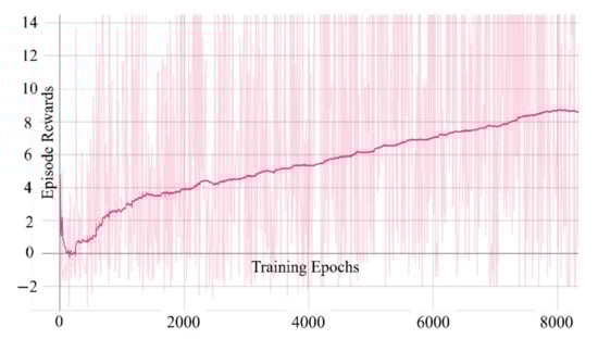 The purpose of this experiment is to determine whether the soft-actor-critic network designed in Section 3 can train the UAV to attain obstacle avoidance capabilities. According to our reward function setting, the drone accumulates more rewards when it continuously avoids obstacles. These rewards will finally be settled as epoch rewards, that is, the rewards accumulated from take-off to crash or reach the end.