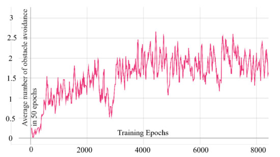 In our experiments, the network was updated after each epoch. Figure 9 shows the graph with the training epochs on the horizontal axis and episode rewards on the vertical axis. It can be seen from Figure 9 that after about 200 epochs (only collecting data in the first 2000 steps without updating the network), episode rewards began to grow gradually. Since the use of reward to reflect the obstacle avoidance ability is not intuitive enough, we recorded the average number of obstacle avoidance times of the agent within 50 epochs during training. Fifty epochs were used to calculate the average value because the agent changed the starting point to the next level every 10 epochs. After 50 epochs, the starting point passed through all levels and then returned to level 1. In an ideal state, if the UAV completes all obstacle avoidance without any collision in 50 epochs, the average number of obstacle avoidances should be 3. As can be seen in Figure 10, as the training progresses, the average number of obstacle avoidances can gradually stabilize above 1 and approach 2 after 4000 epochs training.