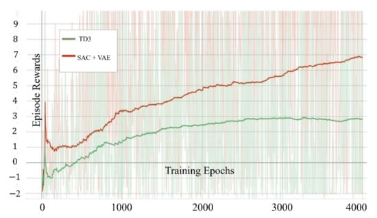 In order to compare the superiority of the model, we also conducted 4000 epochs training on our model and the TD3 algorithm in an experimental environment and compared the reward values obtained. As shown in Figure 11, the improved SAC in our experimental task is significantly better than the TD3 algorithm in both the growth rate and the peak value of the reward value.