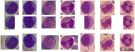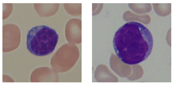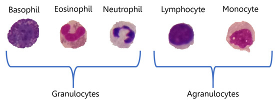 Blood contains three types of cells: platelets or thrombocytes, red blood cells (RBCs) or erythrocytes, and white blood cells (WBCs) or leukocytes. Platelets play an important role in haemostasis, leading to the formation of blood clots when there is an injury to blood vessels or other haemorrhages [1]. Red blood cells are important for the transport of oxygen from the heart to all tissues and carry away carbon dioxide [2]. White blood cells have important functions for the immune system, as they are the body’s main defence against infection and disease [3]. Consequently, their reliable classification is important for recognising their different types and potential diseases. All leukocytes contain a nucleus and can be grouped into two main types, according to the appearance of the structure: granulocytes and agranulocytes. These broader categories can be further subdivided into five subtypes: the first includes basophils, eosinophils and neutrophils, while lymphocytes and monocytes belong to the second [4]. Some examples are shown in Figure 1.