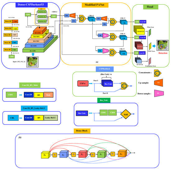 Schematic of (a) the proposed network architecture for plant disease detection consisting of Dense-CSPDarknet53 integrating SPP as the backbone, modified PANet as a neck with a regular YOLOv3 head; (b) dense block structure.