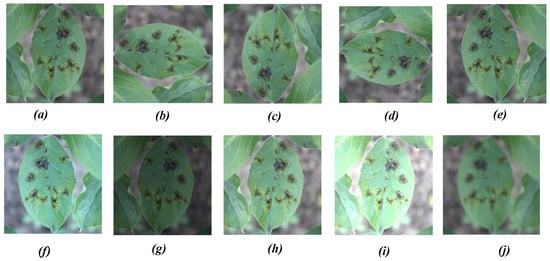 Different image augmentation methods: (a) original image, (b) 90 ACW rotation, (c) 180 ACW rotation, (d) 270 ACW rotation, (e) horizontal mirror projection, (f) color balancing, (g–i) brightness transformation, and (j) blur processing.