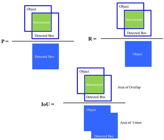 Schematic definition of precesion (P), recall (R) and intersection over union () during object detection.