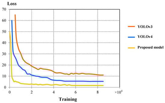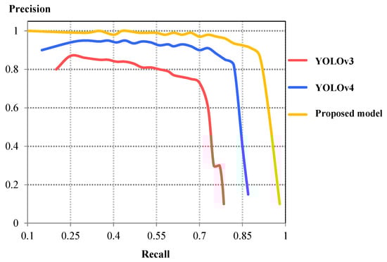 The comparison of precision–recall (PR) curves between these three models is shown in Figure 6. By comparing the characteristics of PR curves, one can conclude that the precision value from the proposed model is higher for a particular recall when the area under the PR curve is the highest between all three models. This indicates that the current model demonstrates better detection accuracy compared to YOLOv3 and YOLOv4.
