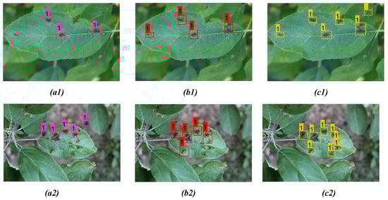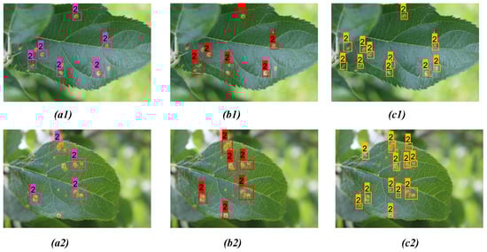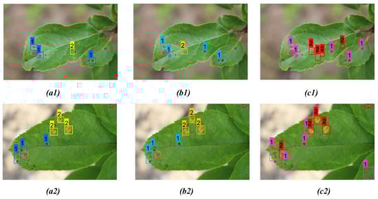 Comparison of detection result for both apple scab and rust on two distinct apple leaves from three models: (a1,a2) YOLOv3; (b1,b2) YOLOv4; (c1,c2) proposed model.