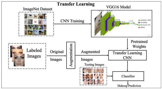 Supervised learning scheme with a transfer learning using pre-trained VGG16 model for makeup detection.