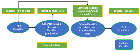 Unlike the supervised learning scheme that requires completely labelled data, semi-supervised learning combines supervised and unsupervised learning techniques. As the name indicates, semi-supervised learning uses both a labelled set of training data and an unlabelled collection of training data. The self-training scheme introduced in [23] works by training the classification models (CNNs) on labelled instances and employing the trained classifier to identify class labels of the unlabelled examples. The predicted class labels with the highest probability of being correct are adopted as pseudo-labels. The examples with pseudo-labels are then used to train the classifier. Once the classifier is trained, it can be used to test unseen instances. The description of pseudo-labelling with self-learning merged with classifier is presented in Figure 3.