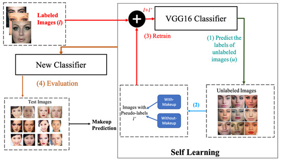 On a conceptual level, this scheme integrates the pre-trained VGG16 model with the self-learning method to double the size of the training dataset by choosing the most reliable examples from the unlabelled image data. The steps of learning process which are repeated until the convergence using makeup labelled images l and an unlabelled images u could be described as follows:
