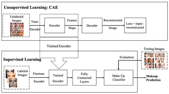 identifies the transpose operation of the encoder layer weights, and ∗ refer to the convolution operation. The objective function targeted to be minimised is defined as cost function to measure the error between the original and constructed images. Figure 5 explains the semi-supervised learning scheme with a convolutional auto-encoder for makeup detection.