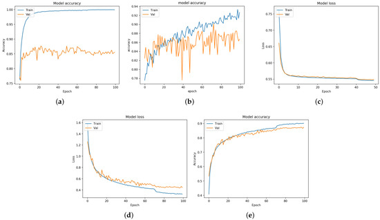 Learning curves of the implemented models (loss and accuracy curves). (a) VGG16 (accuracy); (b) CNN with Self-learning (accuracy); (c) Convolutional auto-encoder (loss); (d) Autoencoder-Classifier (loss); (e) Autoencoder-Classifier (accuracy).