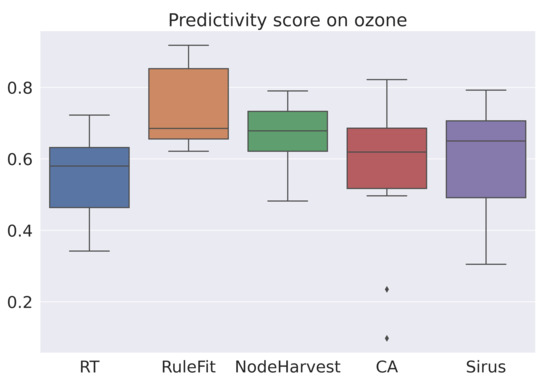 The averaged scores are summarized in Table 4. As expected, RuleFit is the most accurate algorithm. However, RuleFit is neither stable nor simple. SIRUS is the most stable algorithm and the Covering Algorithm is one of the simplest. For all datasets, SIRUS seems to be the most interesting algorithm among this selection of algorithms and by our score (6). Figure 1, Figure 2 and Figure 3 are the box-plots of the predictivity scores, q-stability scores and simplicity scores, respectively, of each algorithms on the dataset Ozone.